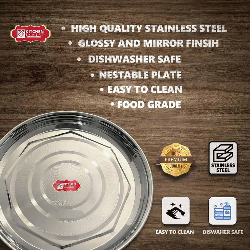 Kitchen Expert Stainless Steel Dinner Plate Set is made food-safe, durable and long-lasting from 100% food-grade stainless steel.